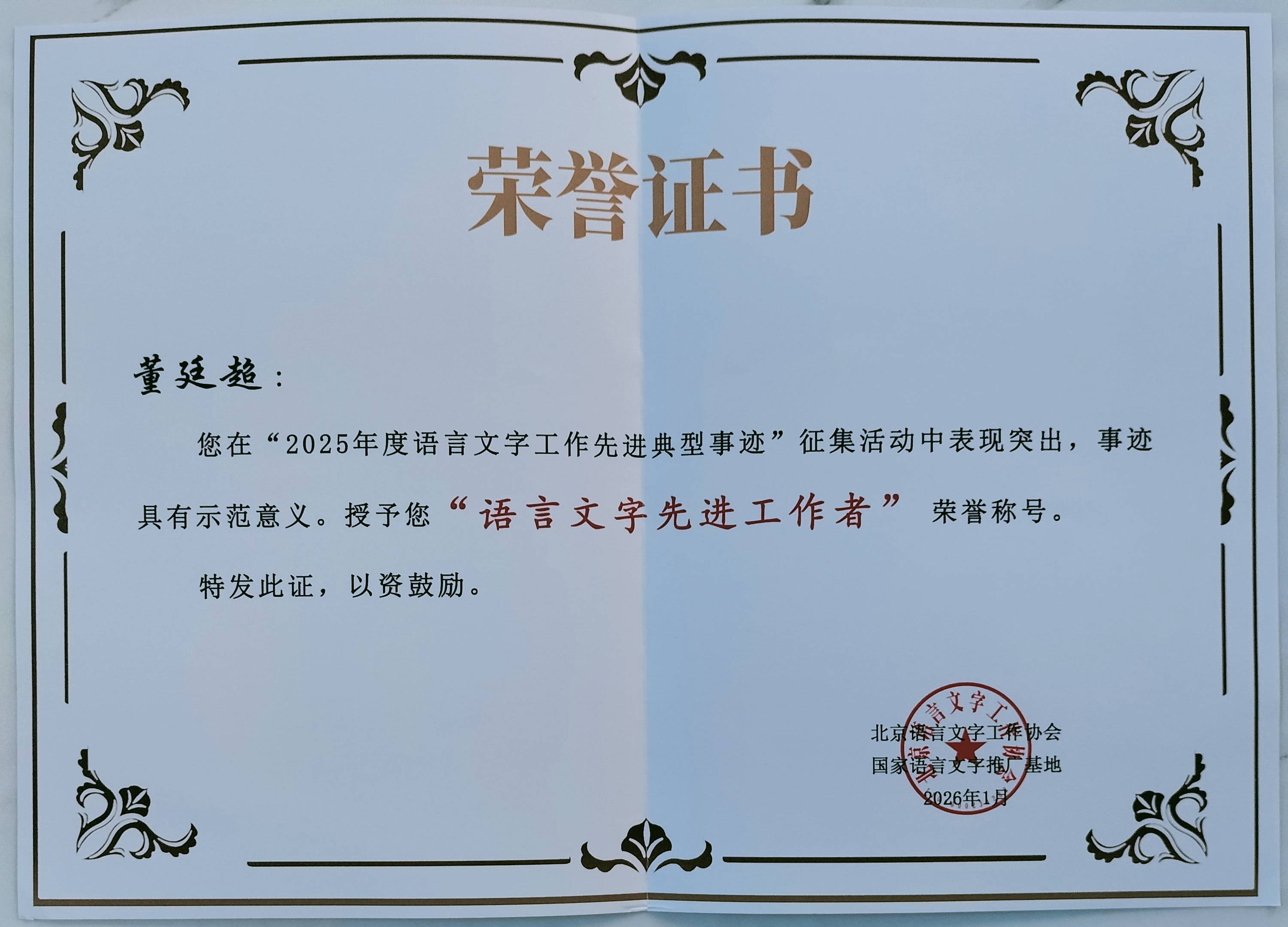 2026年1月,北京市语言文字工作协会2025年度“语言文字先进工作者”荣誉称号。