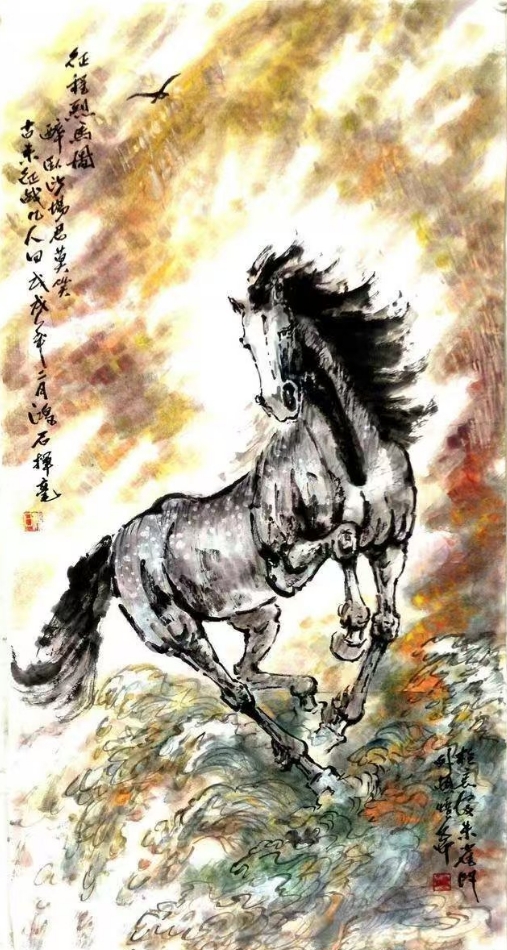 在笔墨意境上,他深谙水墨之道,以干湿浓淡的笔墨变化,勾勒骏马的灵动姿态与精神神韵。笔下的骏马,或奔跃腾骧、气势如虹,或静立沉思、温婉灵动,线条遒劲有力,墨色层次丰富,既有传统水墨的笔情墨趣,又有西方绘画的造型美感,实现了“形”与“神”的完美统一。如《奔马图》,通过精准的骨架刻画与灵动的笔墨渲染,将“春风得意马蹄疾”的诗意意境展现得淋漓尽致,笔墨间流淌着自然灵动之气,让人仿佛能感受到骏马奔腾的劲风。