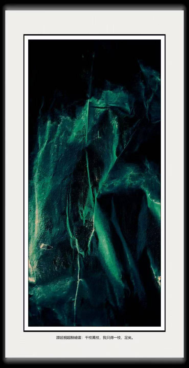 谭延桐这幅画作用超验的语言,推翻了多即是好的经验认知,重建了少即是多的本质观。色彩的对比、笔触的肌理、线条的流动、构图的生长,所有视觉元素都指向同一个主题,生命的意义在于抓住那一枝本质。那抹从黑暗中生长出来的绿,不是具体的枝,而是我们每个人内心的本质,可能是对艺术的热爱,也可能是对亲情的坚守,亦或者对真理的追求。当我们抓住这一枝,就抓住了生命的全部,因为“足矣”不需要更多,因为“一”已经包含了万物的本质,已经支撑起整个生命的重量。站在画前,我们会被一枝的本质感击中,画作像黑暗中的光、森林中的树、灵魂中的根。这是生命的原初状态,是精神的核心脉络,是艺术的终极真谛。“千枝万枝,我只得一枝,足矣”,超验绘画的使命就是照亮本质。这幅画是谭延桐对这一使命的完美践行。艺术大师提醒我们,在千枝万枝的繁杂中,不要忘记抓住自己的一枝;在欲望膨胀的世界里,不要忘记“足矣”的智慧。