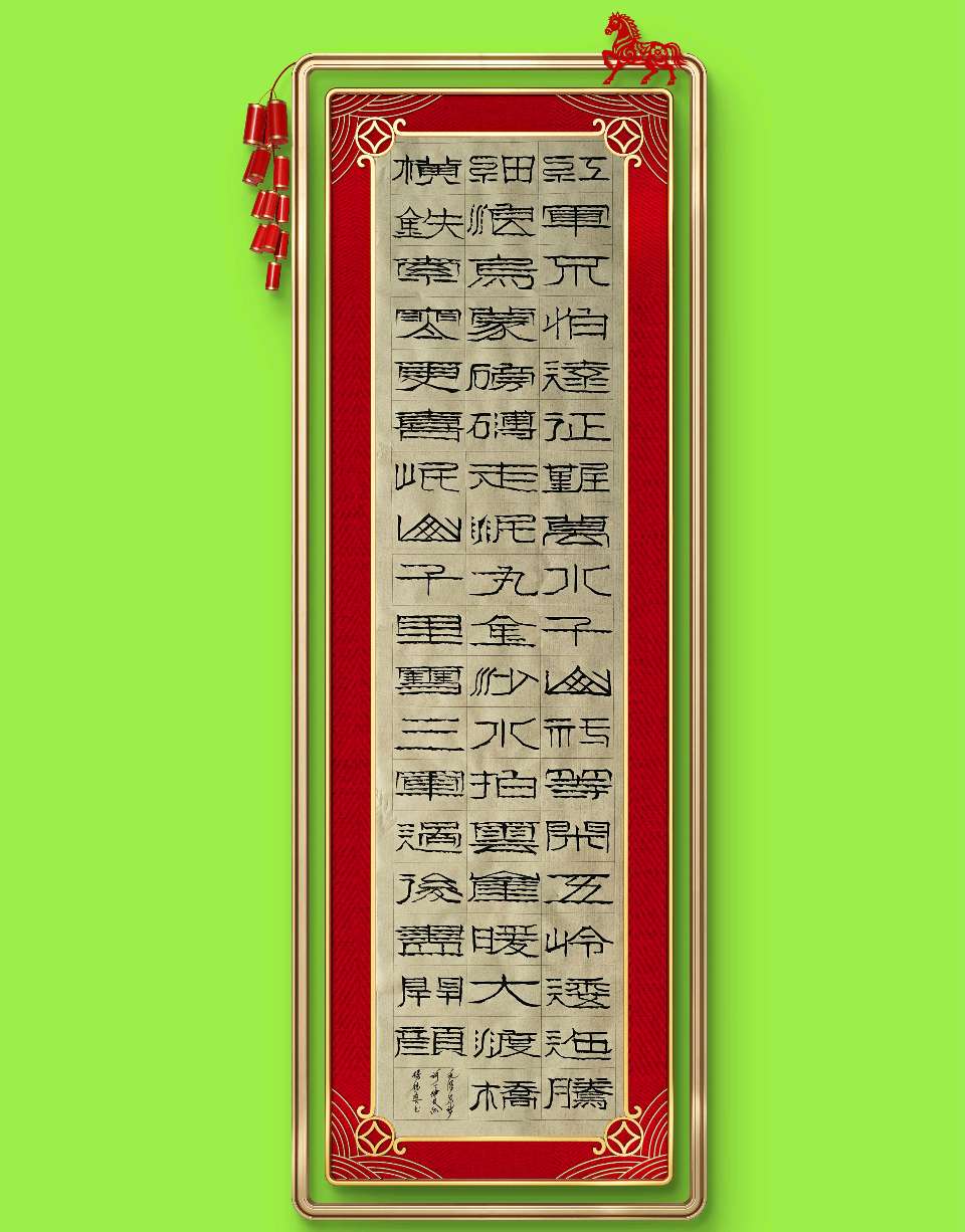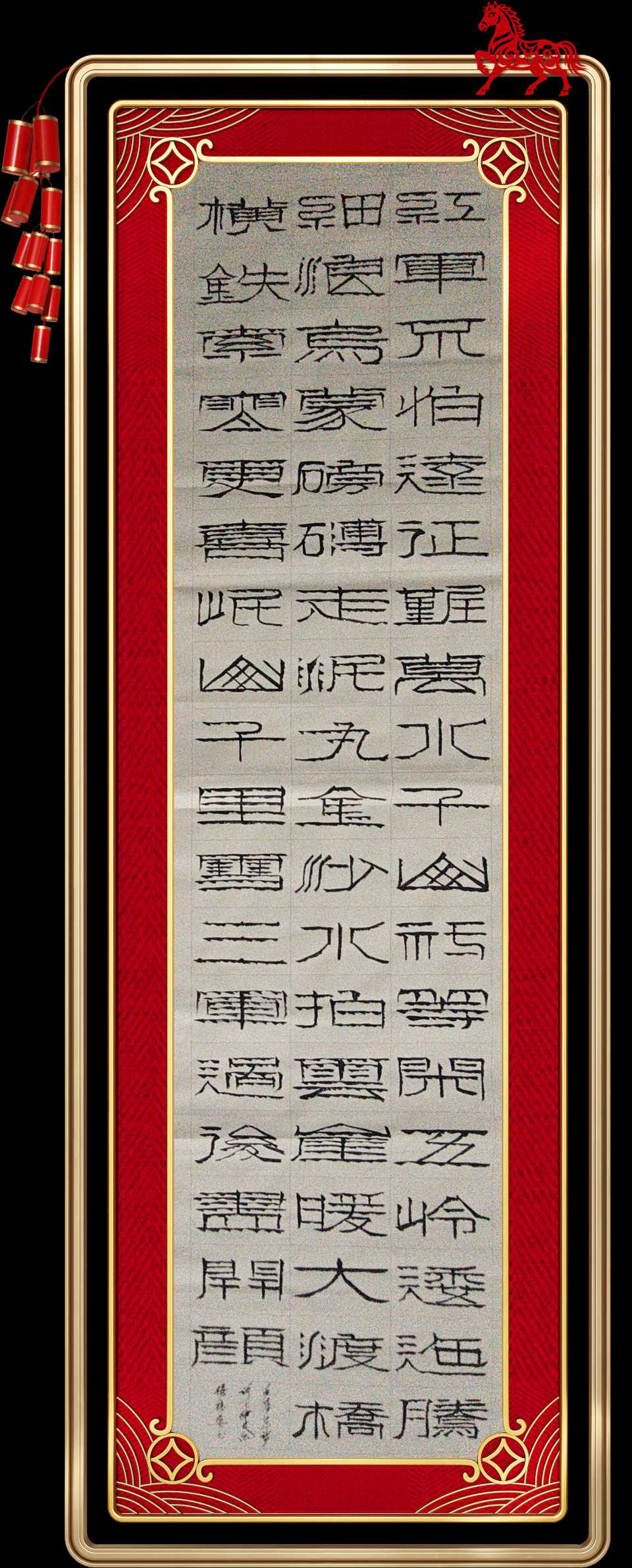 早晨的空气特别清新,杨胜华老师走进自己的那间书画创作室里,怀着对开国领袖的无限崇敬,打开宣纸拿出了毛笔,并倒好墨汁在砚台里,于是满腔热情开始书写《七律长征》。他想还是用隶书体来写一写,不过要有所创新才行,他自称是“我体”,书写只要表达自己的思想感情就行。他写“红军不怕远征难,万水千山只等闲”这两句,马上回想起在电视上看到的红军长征视频,这两句话高度概括了红军战士面对困难和挫折不会灰心丧气、勇往直前的精神,而万水千山对红军战士来说显得又渺小一些,因而冷静应对各种各样的问题。