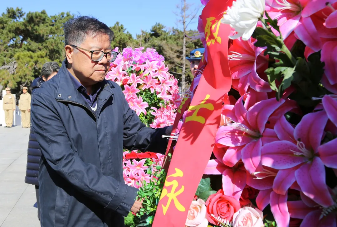 敬献花圈环节,葛本亮、徐克刚、陈美霖、殷立军、汤清五位领导缓步上前整理缎带,《献花曲》悠扬庄重,全体人员肃立致敬,以鲜花寄哀思,以敬意缅忠魂。