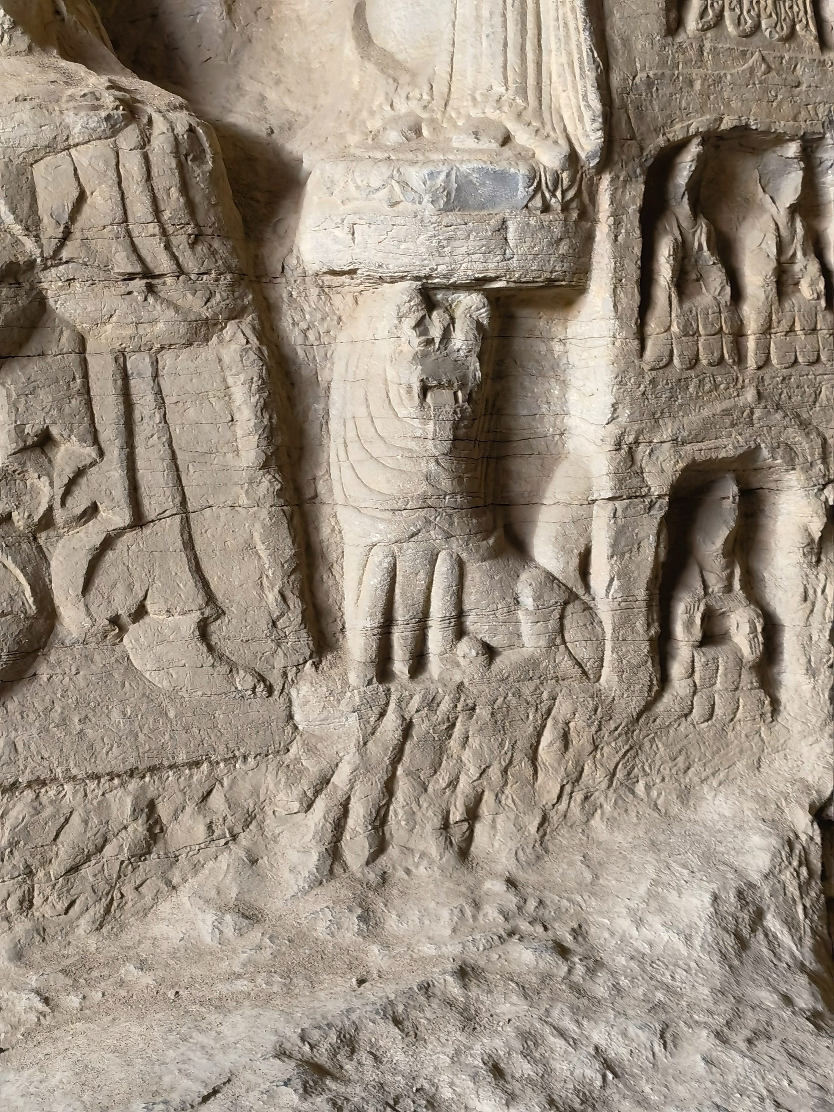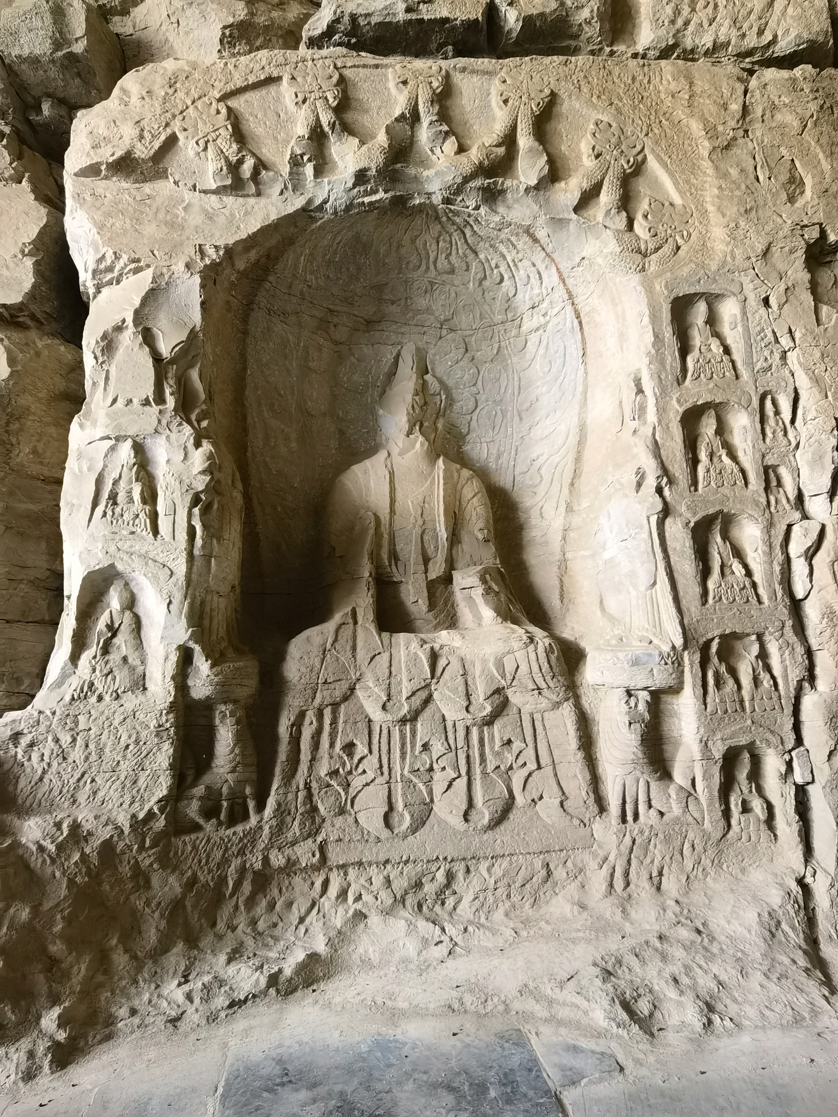 虽距离没多远,却还是第一次光临。这里确是一处神秘之地,始建于北魏的水泉石窟,安静地坐落于寇店镇水泉村幽静的山坳里,利用天然的溶洞,在石壁、岩石上因势就形,雕刻出神态各异的佛像,许多匪夷所思的雕刻造型与技艺,在众多的石窟艺术中独树一帜,讲故事,传佛音,蕴禅意,保存了许多宝贵的石窟雕刻艺术与思想,从发现到现在,吸引了海内外众多石窟艺术、佛教研究者的关注。可惜在千年沧桑中历经数次磨难,雕像被毁严重,尤其是改革开放后文物一度被盗,大量雕像面部,有特点的手足等被斫掉,前期地方政府重视不够,前段才做了保护,设置保护围栏,大门,安装监控,安排保护人员日夜看护。