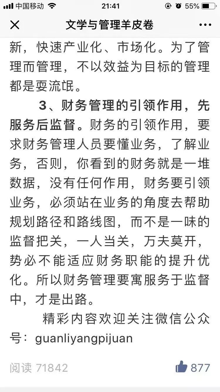 2017年5月,我写了一篇《过度的规范管理对企业来说也是犯罪》的文章,发表到文学与管理羊皮卷公众号后,在不到一个月的时间内,点击阅读人数达7.1万余次,点赞877个,评论跟帖102个,获得赞赏款587元,增粉1000余人。获得了较好的传播效果。