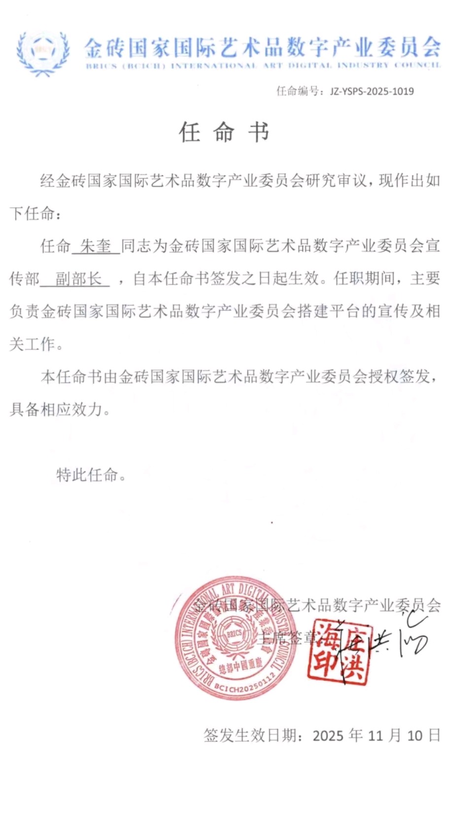 任命朱奎同志为金砖国家国际艺术品数字产业委员会宣传部副部长丨京港澳台世界头条发布