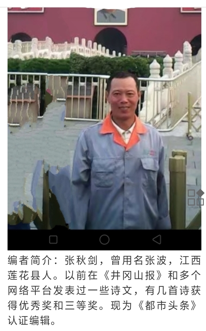 张秋剑,江西莲花县人。曾在《井冈山报》和网络平台发表过一些诗文。有几首诗获优秀奖。现为都市头条认证编辑。(微信苟启祥或海螺)