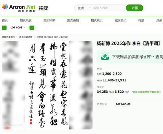 当代水墨市场再添新锐!书法家杨新博作品《清平调》3.4万元成交