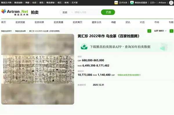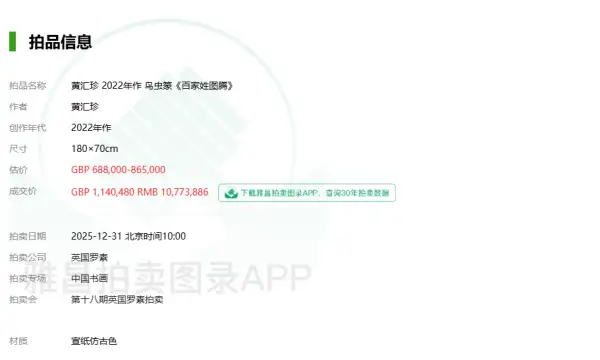 黄汇珍作品鸟虫篆《百家姓图腾》在英国罗素拍卖公司落锤成交