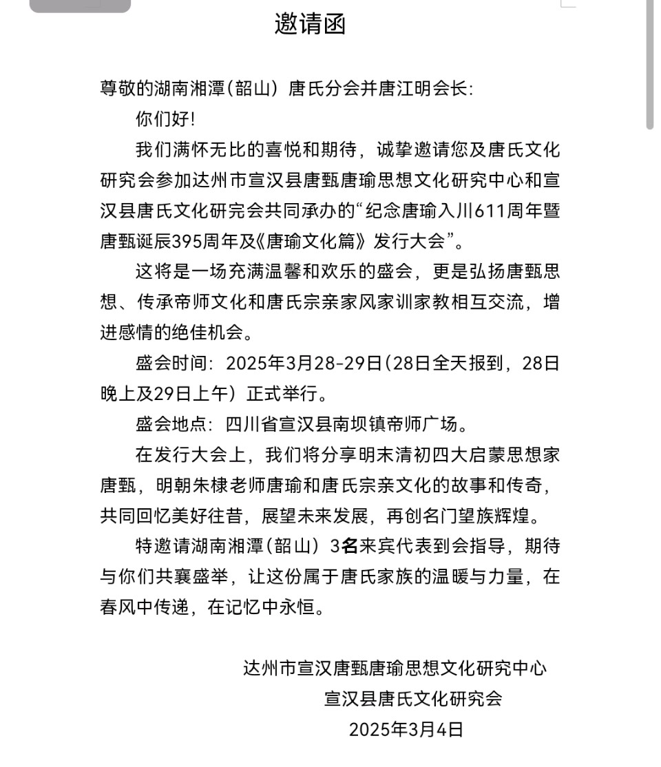 【唐江明会长应邀参加四川省达州市宣汉县“纪念唐瑜入川611周年暨唐甄诞辰395周年及《唐瑜文化篇》发行大会”】~14616期~新京都文艺