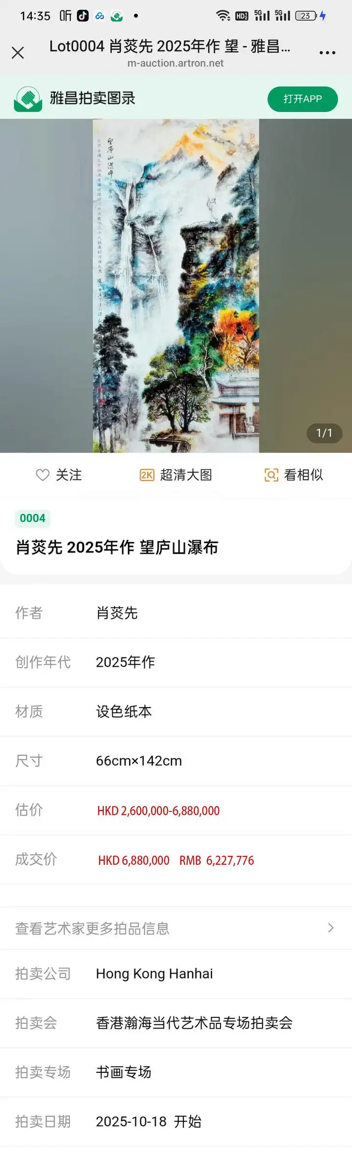 画家肖菼先作品望庐山瀑布在香港瀚海拍卖成功拍卖