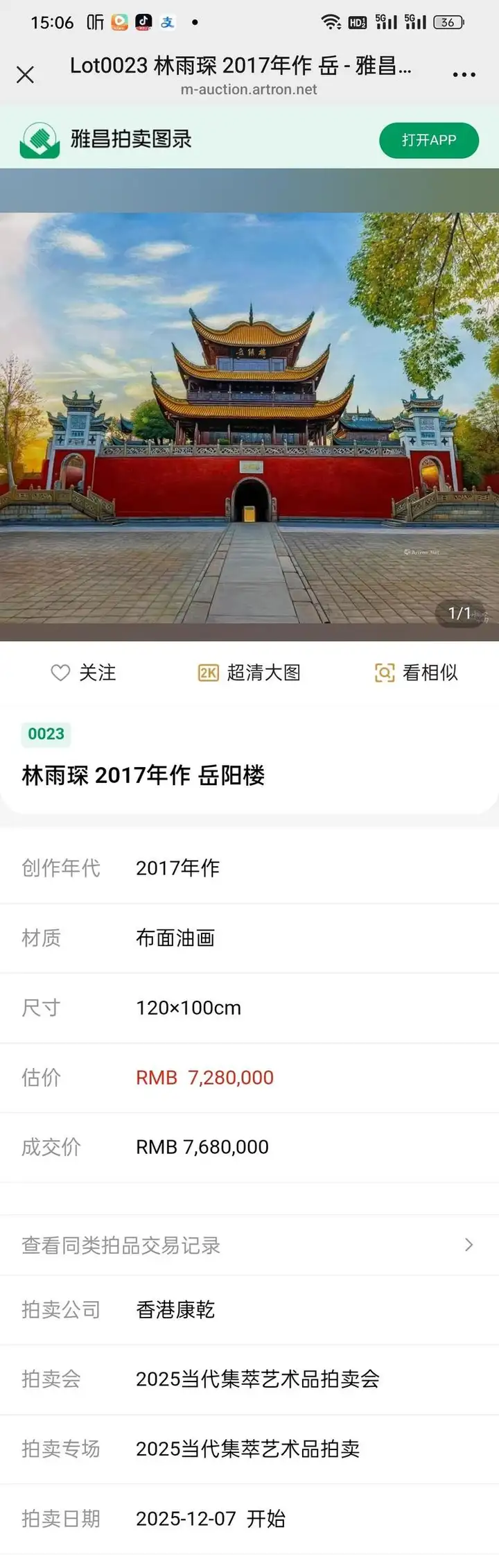 著名画家林雨琛作品岳阳楼在香港康乾拍卖成交