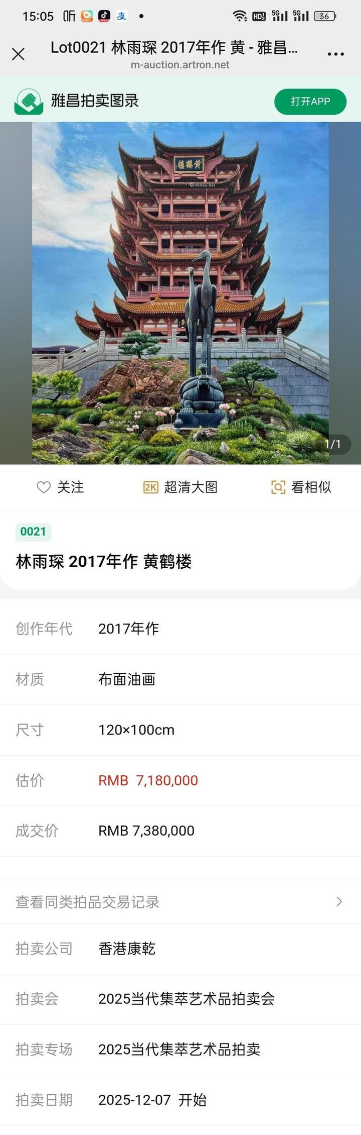 著名艺术家林雨琛油画作品黄鹤楼在香港康乾拍卖成功拍卖