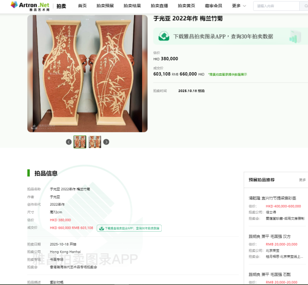 篆刻家于光亚作品《梅兰竹菊》在香港瀚海拍卖公司以66万元成交!