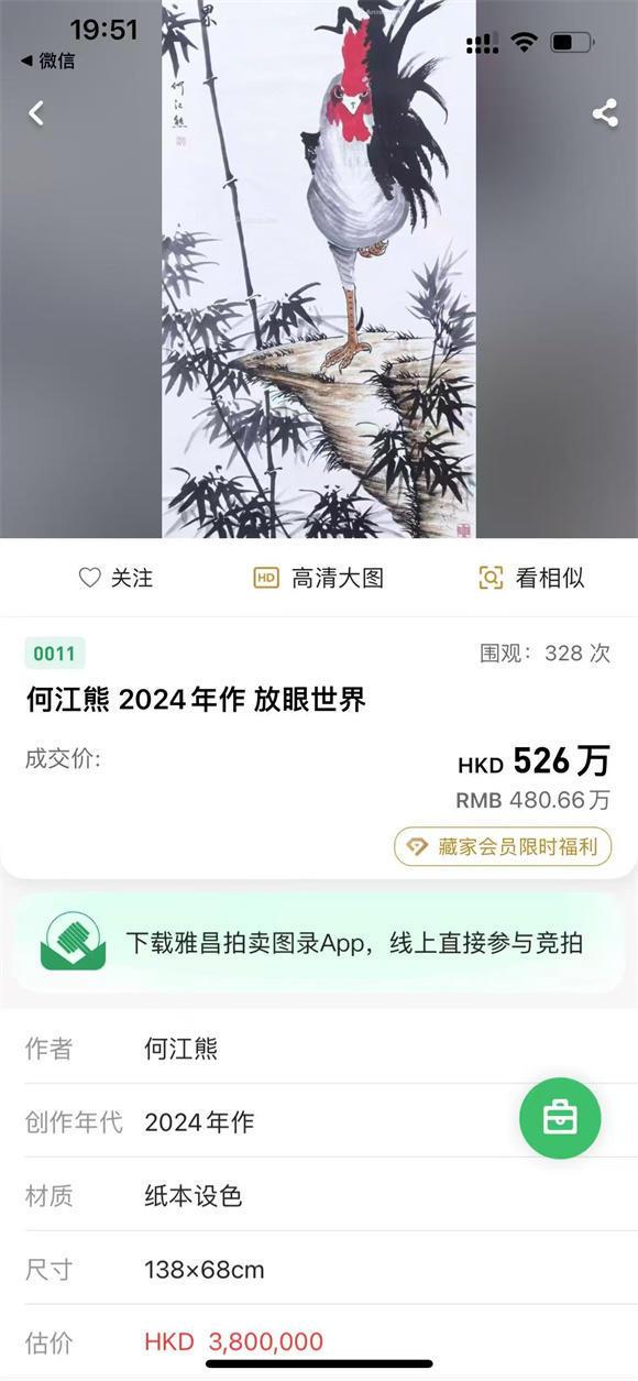 何江熊《放眼世界》526万港元落槌香港瀚海,雄鸡题材再掀收藏热潮