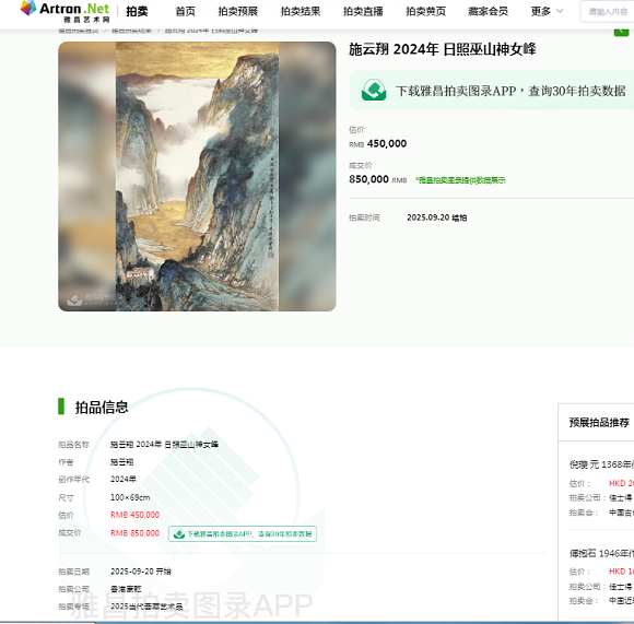 画家施云翔作品《日照巫山神女峰》在香港康乾拍卖公司落锤成交!