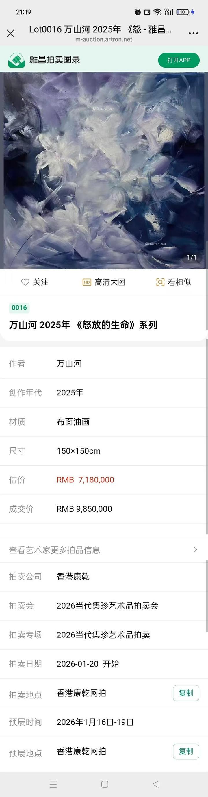 2026年画家万山河作品《怒放的生命》系列在香港康乾拍卖成交