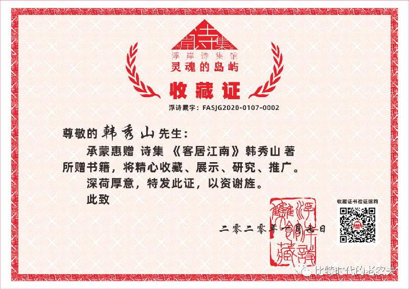 韩秀山诗集《客居江南》被浮岸诗集馆收藏