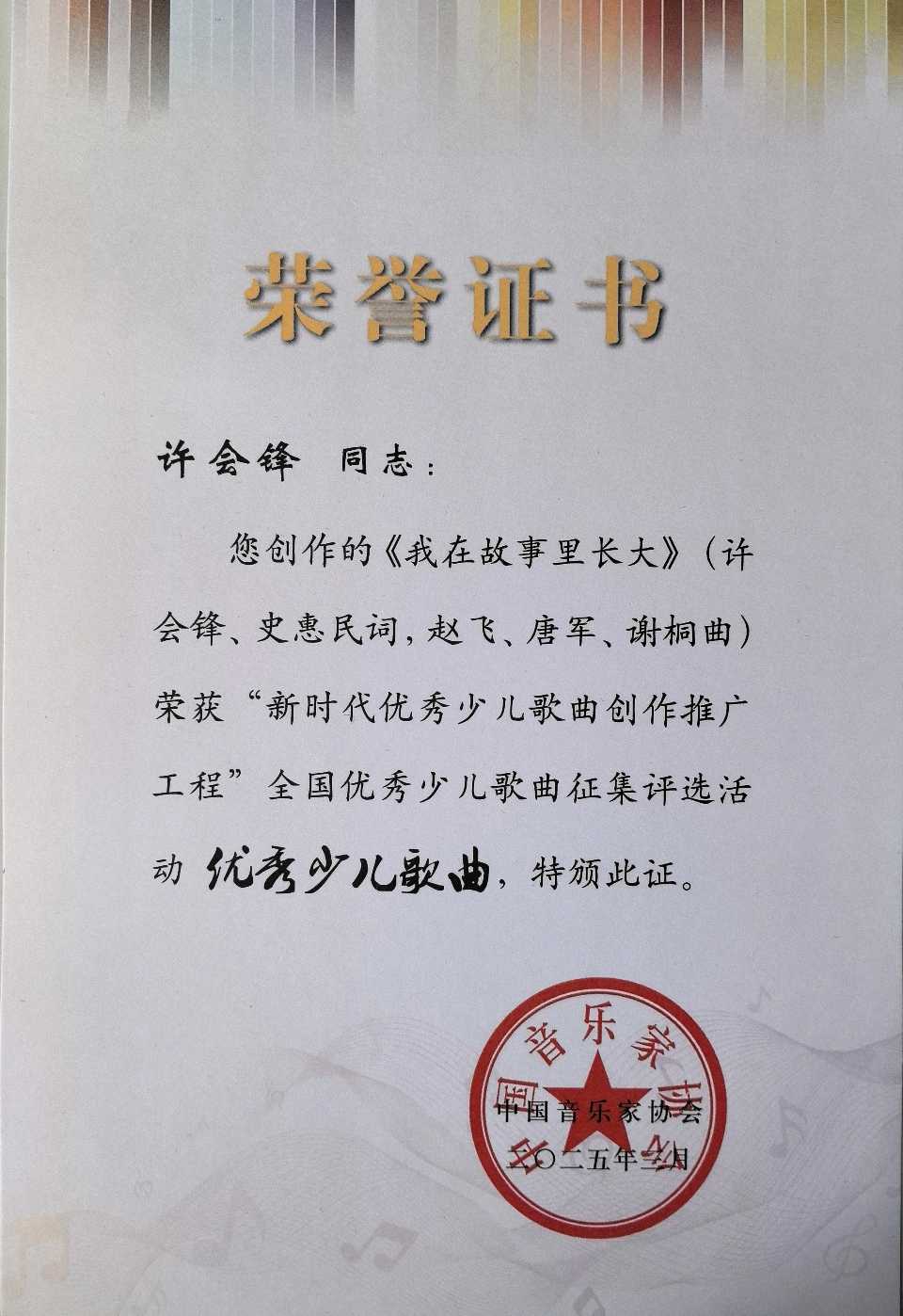 河南许昌:许昌音乐人许会锋创作的《我在故事里长大》荣获中国音协“优秀少儿歌曲”