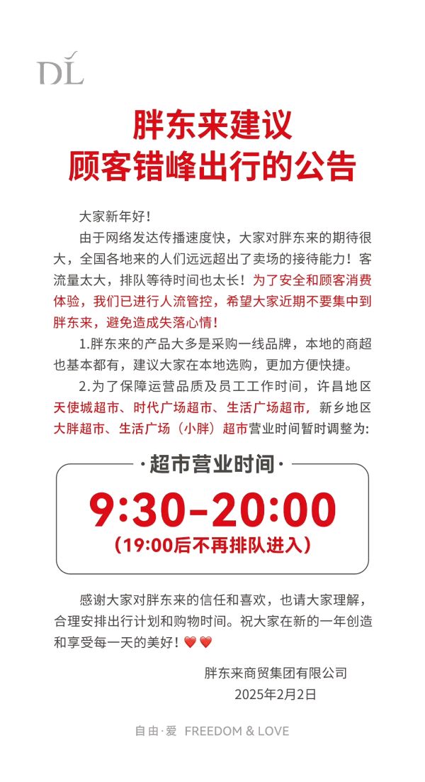 河南许昌:胖东来关于建议顾客错峰出行的公告