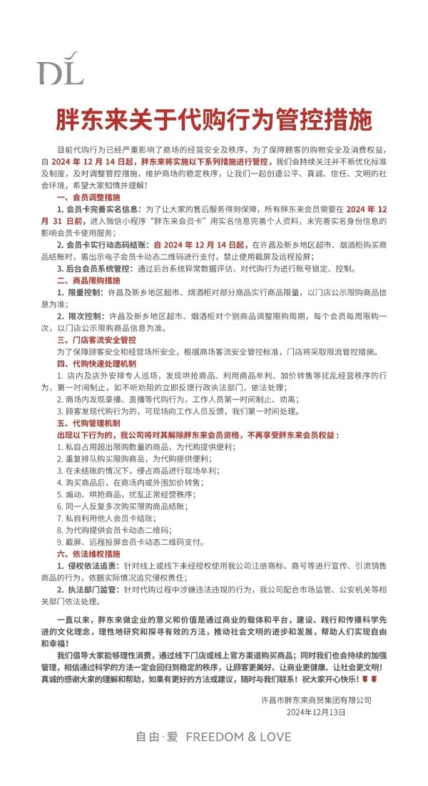 河南许昌:胖东来发布关于代购行为管控措施