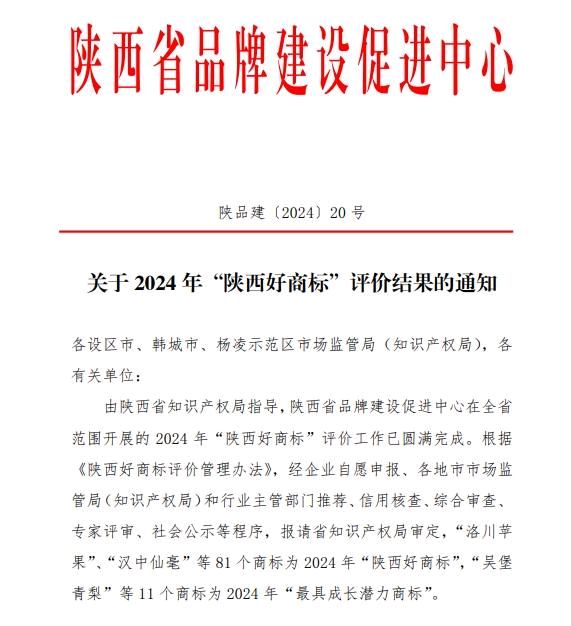 山阳1家企业荣获“陕西好商标”荣誉