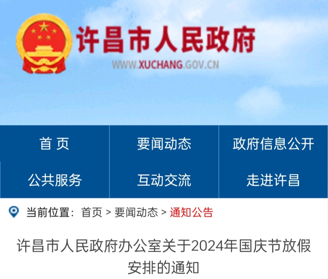 河南许昌:许昌市人民政府办公室关于2024年国庆节放假安排的通知