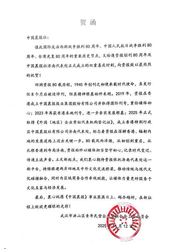 武汉市洪山区青企联工会委员会贺《中国晨报》创刊八十周年:共搭桥梁助民族复兴新征程
