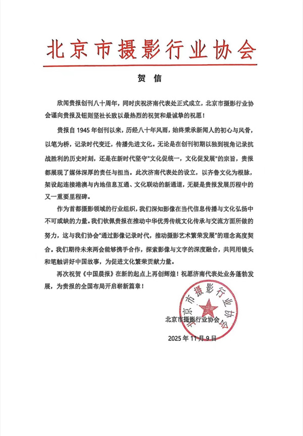 《中国晨报》创刊八十载 济南代表处成立获北京市摄影行业协会贺信盛赞