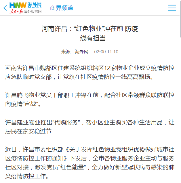 《人民日报》海外版报道河南省许昌市魏都区“红色物业”抗击新型冠状病毒感染肺炎疫情工作做法