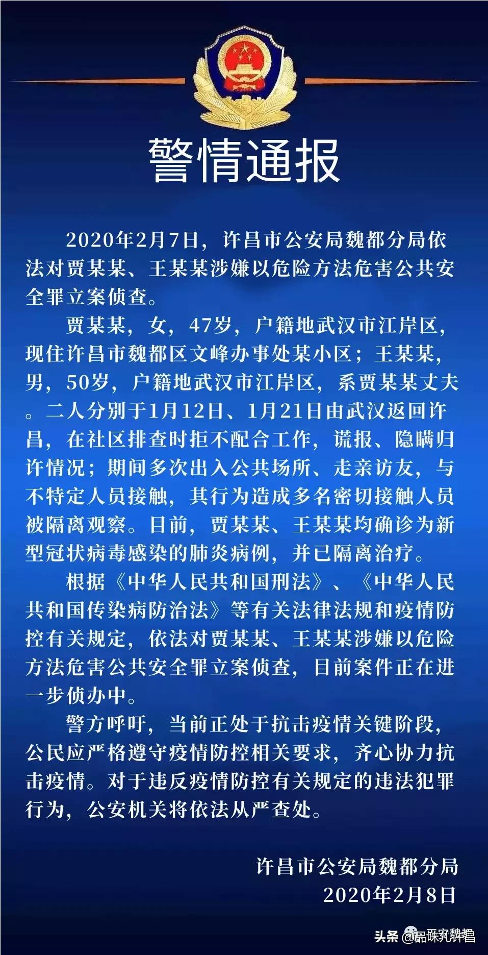 许昌对瞒报武汉返回史的两例确诊病例立案侦查!