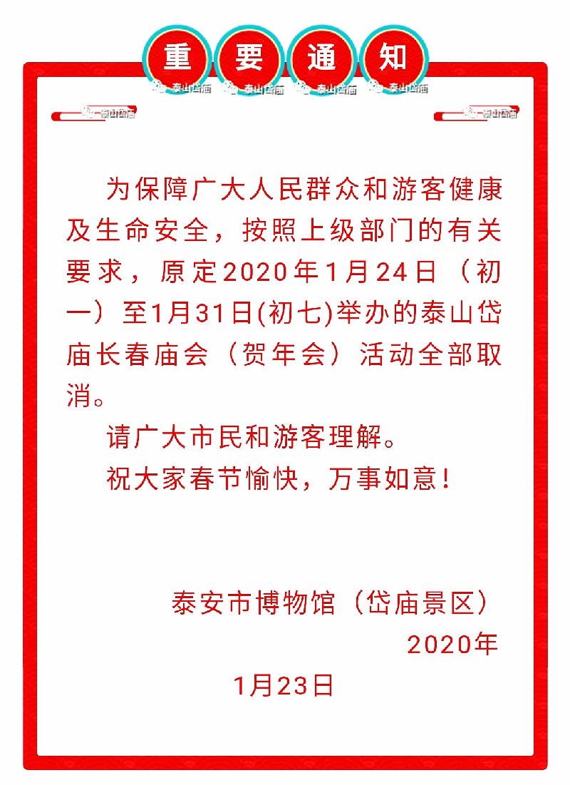 春节假期泰山岱庙长春庙会(贺年会)活动取消的通知