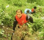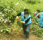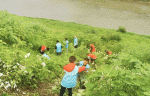 桃江县蓝天志愿者协会的“河小青”志愿服务队志愿者来到资江獭溪河河段,清除当地的“加拿大一枝黄花”