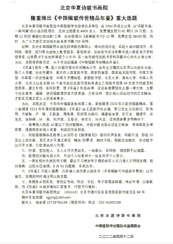 北京华夏诗联书画院隆重推出《中国楹联传世精品年鉴》重大选题