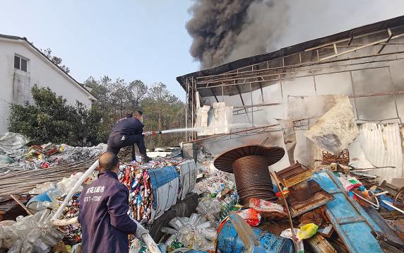废旧回收站突发火灾 民警在火海中拎出煤气罐