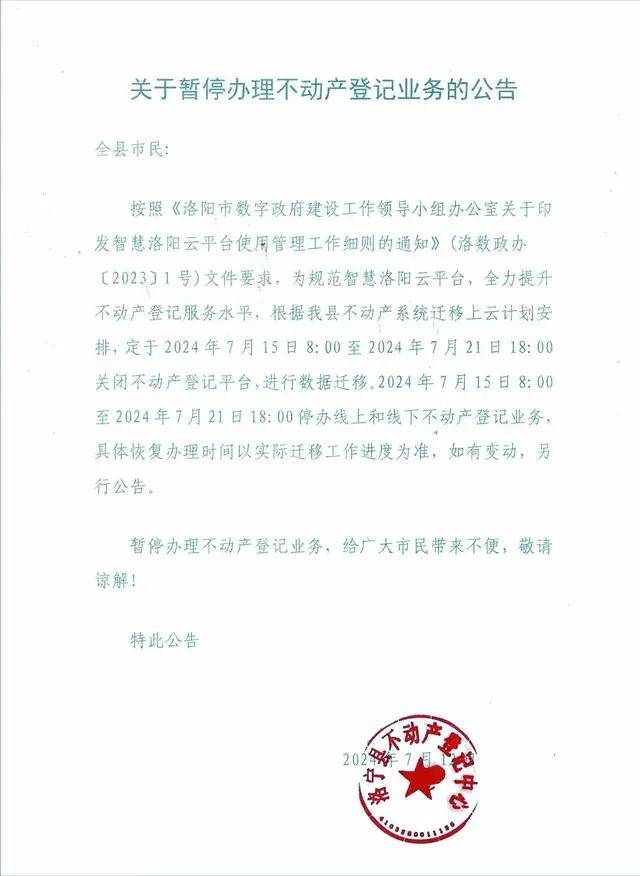 洛宁县关于暂停办理不动产登记业务的公告