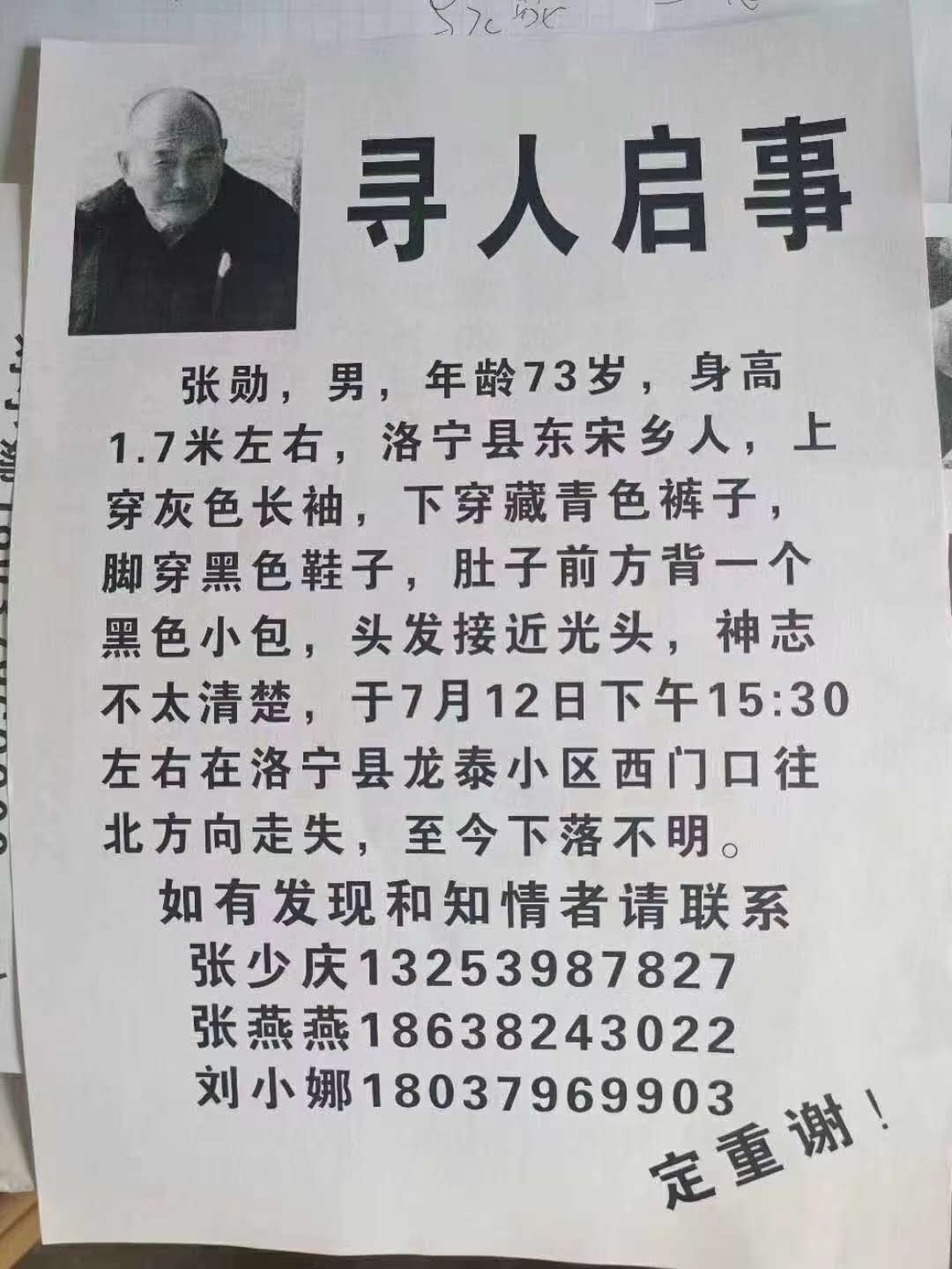 寻人启事:寻找7月12日下午从洛宁县龙泰小区走失的73岁老人张勋