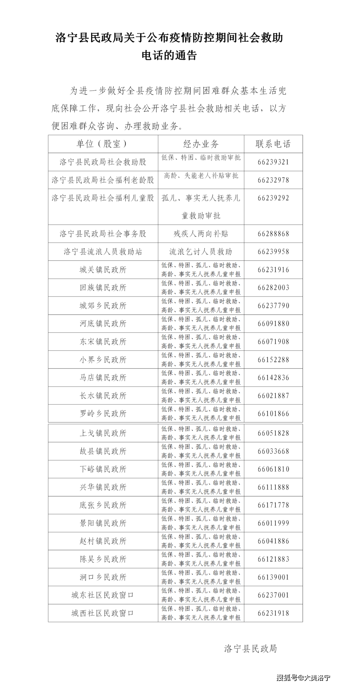 洛宁县民政局关于公布疫情防控期间社会救助电话的通告
