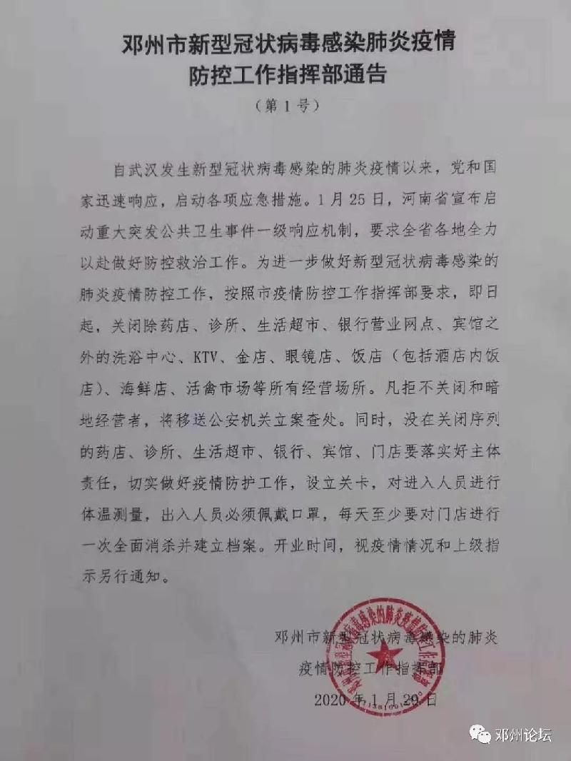 邓州新增4例,累计确诊10例!即日起关闭KTV、饭店、洗浴中心等经营场所!