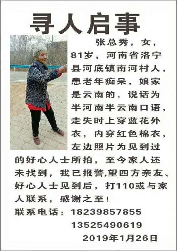 寻找走失的洛宁县河底镇南河村81岁老人张总秀