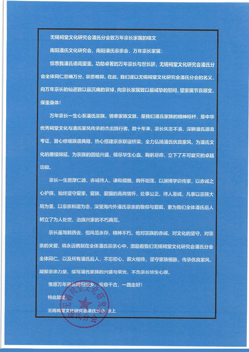 无锡祠堂文化研究会潘氏分会致万年宗长家属的唁文
