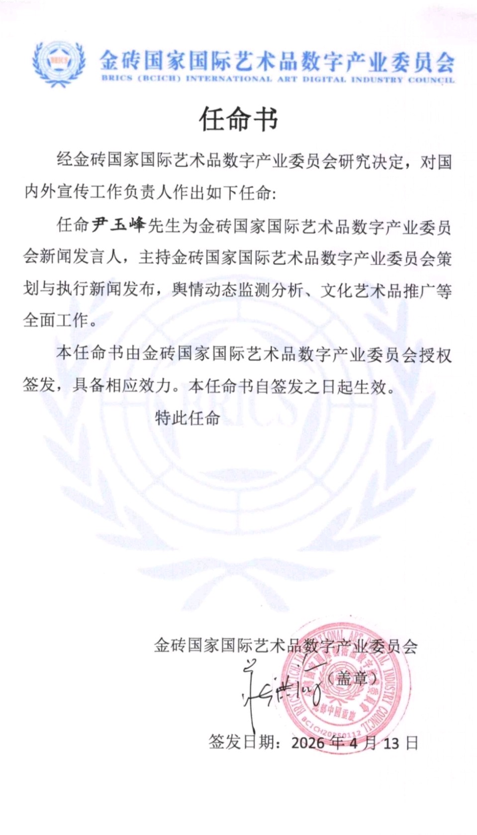 任命尹玉峰先生为金砖国家国际艺术品数字产业委员会新闻发言人