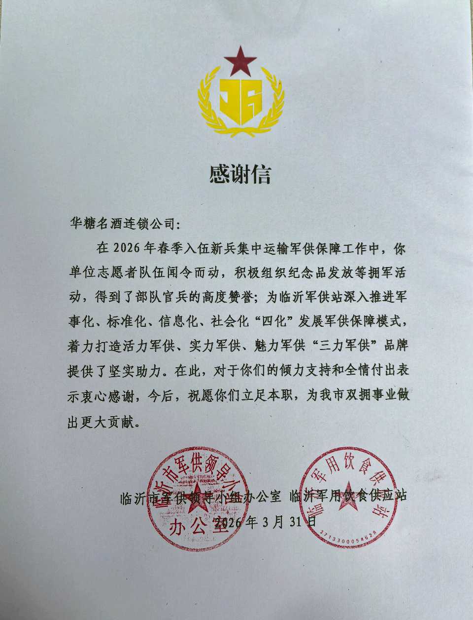 双拥共建聚合力 拥军支前显担当一一华糖名酒连锁公司助力新兵军供保障获军供系统感谢信