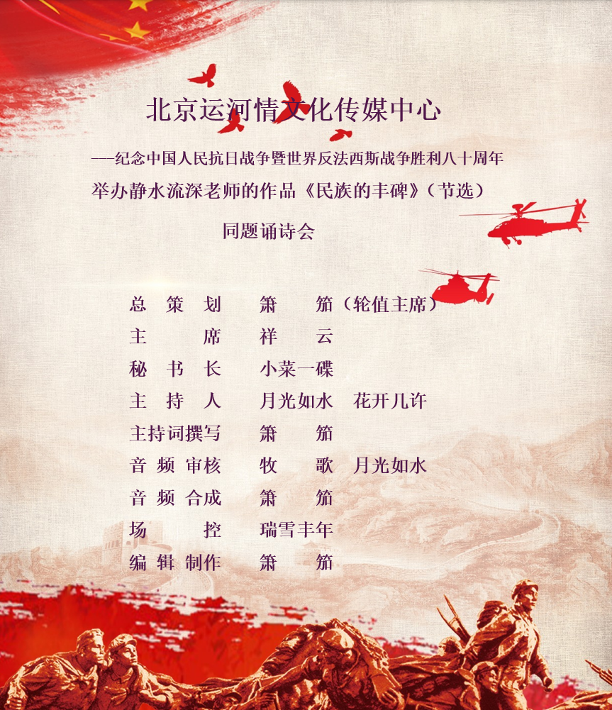 北京运河情文化传媒中心举办诗人静水流深的作品《民族的丰碑》(节选)同题诵诗会 编辑 : 箫笳【运河情】(第1272期)