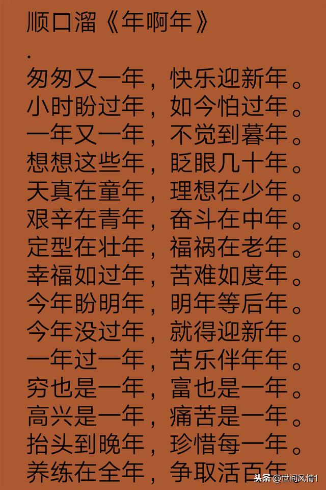 匆匆又一年,快乐迎新年;抬头到晚年,珍惜每一年~顺口溜〈年啊年〉