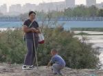 秋色染塘碧翠茵,宁静河湾休闲人。如镜水面仙境画,映衬蓝天白云真。度步河岸亲子教,启萌孩童智慧根!