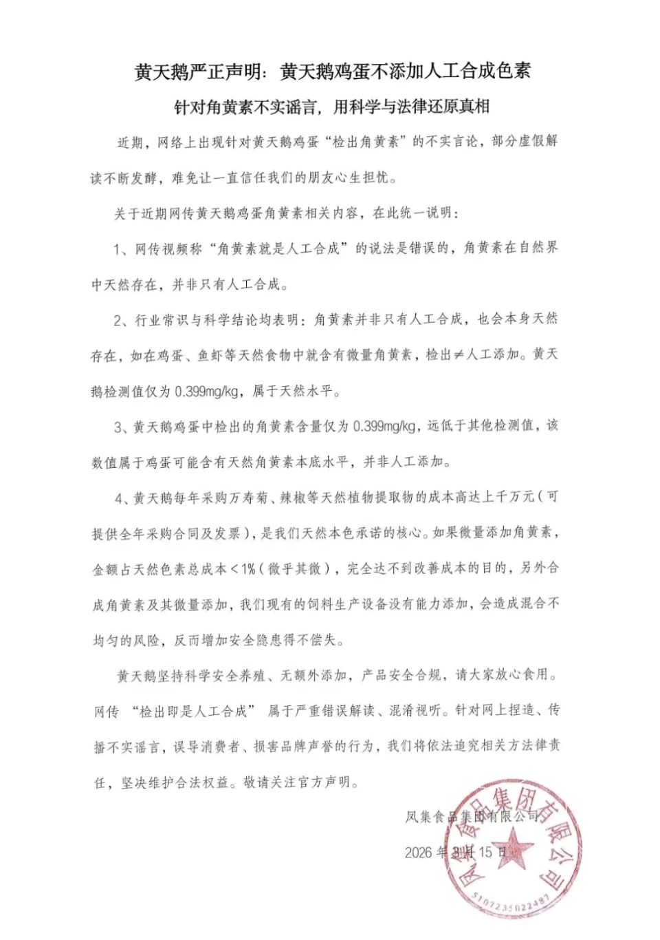 胖东来售卖鸡蛋被指添加色素,生产企业回应:纯属恶意混淆概念,造谣生事,公司已正式启动法律程序。