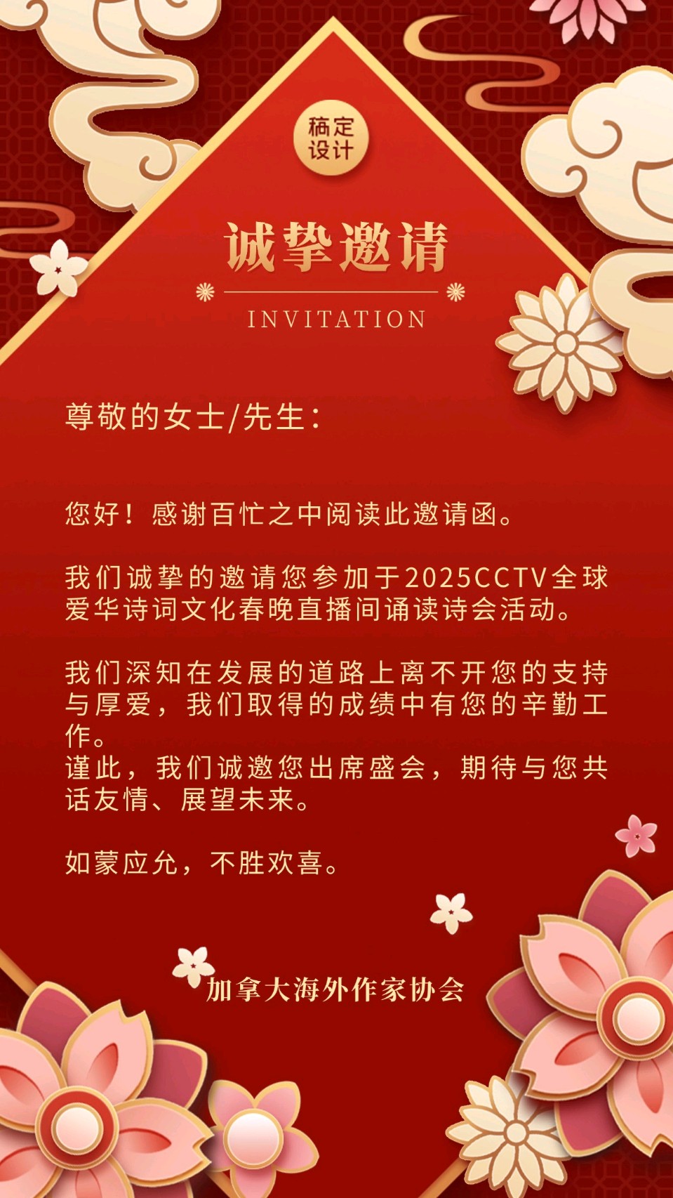 2025年“金蛇舞春乡思浓”CCTV全球爱华诗词文化春晚将于2月5日北京时间21:00在腾讯会议室(会议号码565-603-457)盛大直播。