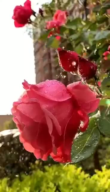 雨后玫瑰藏冷涩,盼来阳旭绽苞芳。
