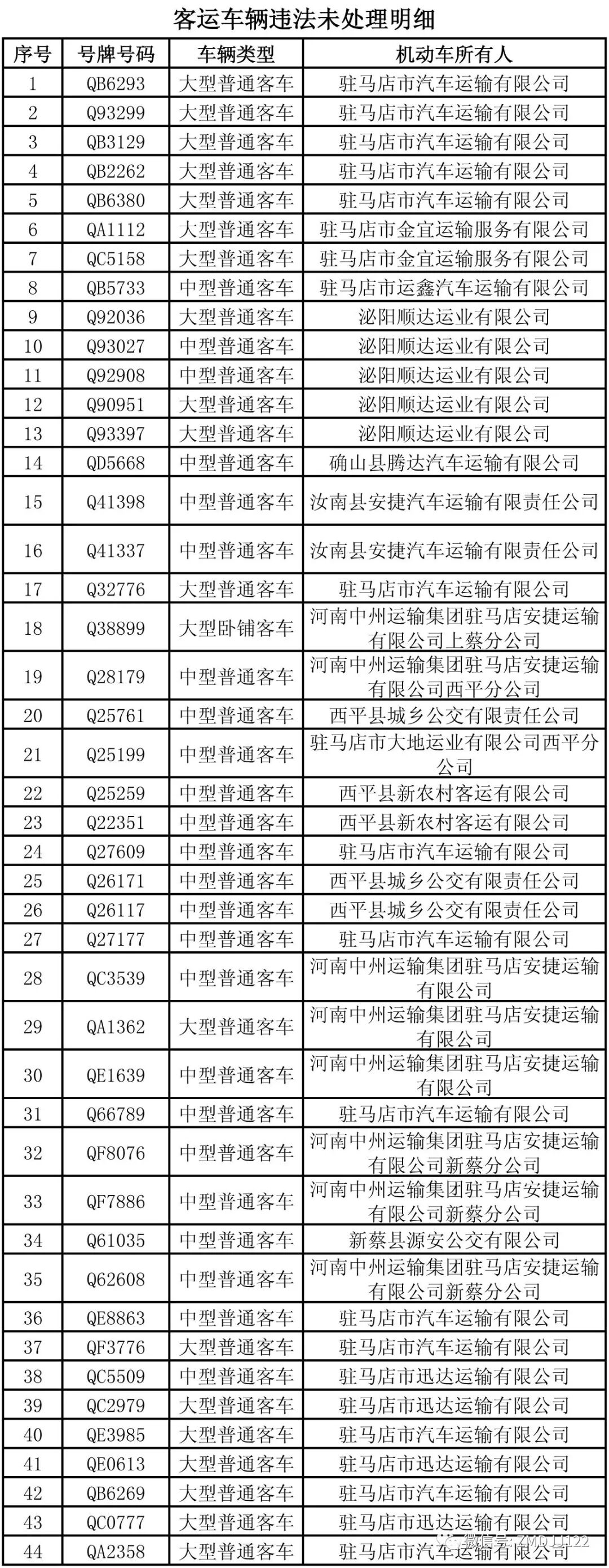 经核查,截止11月4日,以下附表中65辆客运车辆存在交通违法未处理安全隐患,请车辆所属运输企业/所有人切实履行交通安全主体责任,及时处理交通违法,汲取交通违法教训,加强驾驶人交通安全教育,消除交通安全隐患,确保道路交通安全(如交通违法已处理,请忽略)。