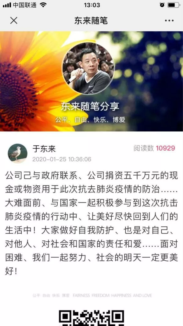 1月25日,许昌市胖东来商贸集团有限公司负责人于东来个人微信公众号“东来随笔分享”发布信息称:公司已与政府联系,公司捐资五千万元的现金或物资用于此次抗击肺炎疫情的防治……大难面前、与国家一起积极参与到这次抗击肺炎疫情的行动中、让美好尽快回到人们的生活中!大家做好自我防护、也是对自己、对他人、对社会和国家的责任和爱……面对困难、我们一起努力、社会的明天一定更美好!