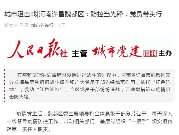 按:2月10日,《人民日报》城市党建周刊报道许昌市魏都区依托“红色阵地”,发动“红色细胞”,充分发挥基层党组织战斗堡垒和广大党员干部先锋模范作用,五项举措筑牢疫情阻击防火墙工作做法。现将文章予以转发交流。